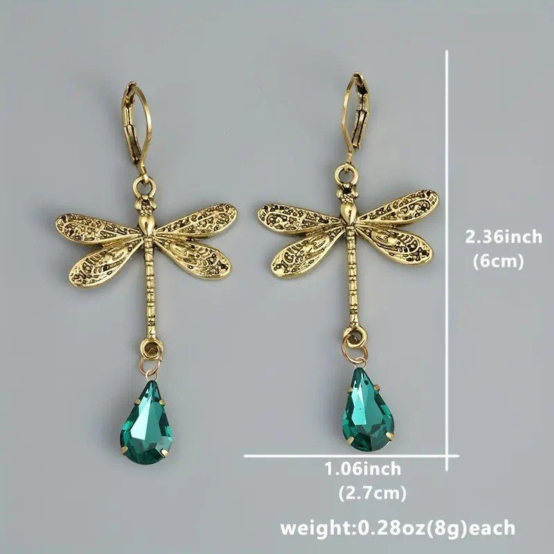 Retro Dragonfly Inlaid Green Water Drop Gem Earrings